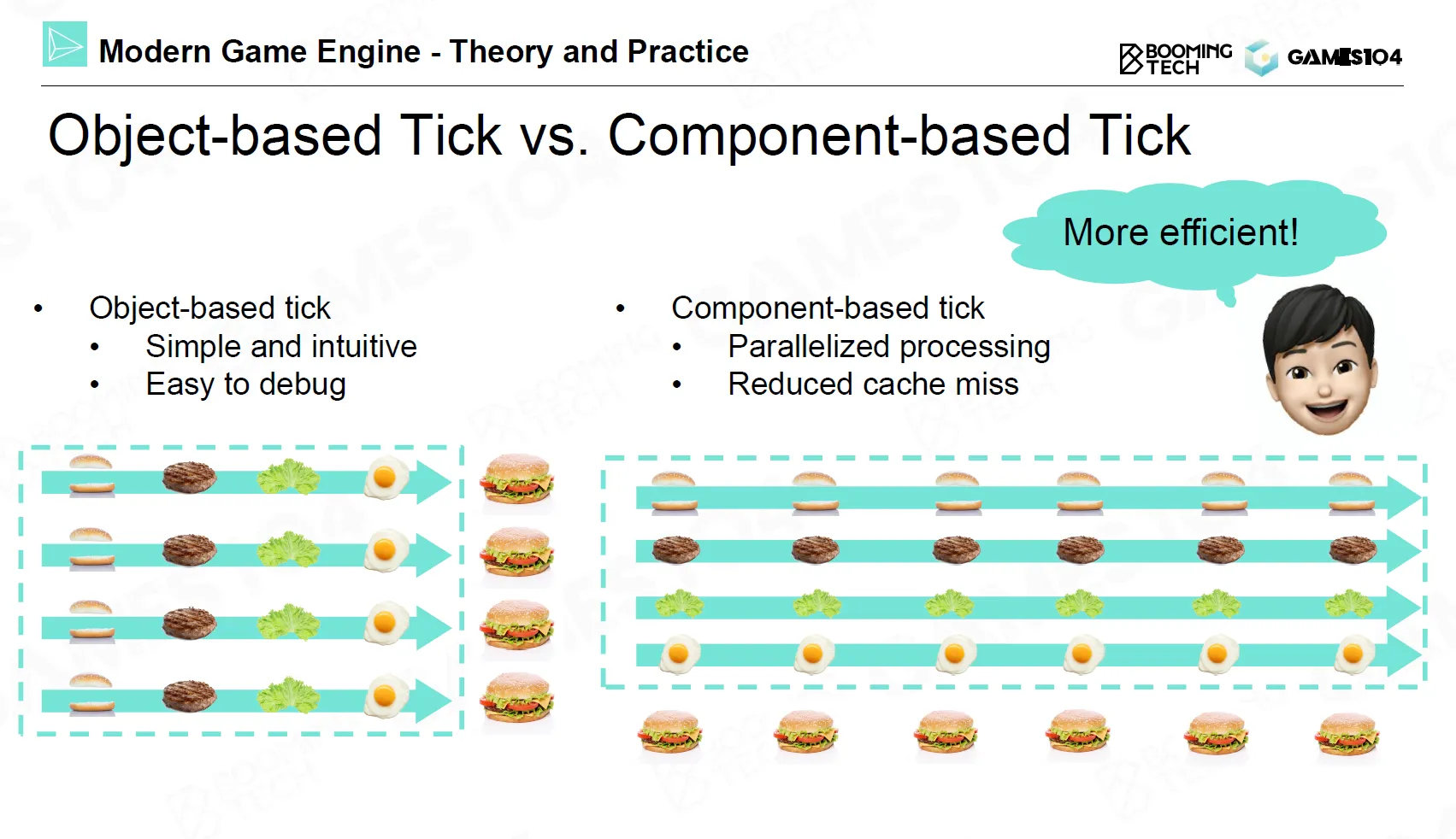 component-based tick相对要反直觉一点,但却有着更高的性能。component-based tick相当于把系统的tick()函数分解成流水线,这样可以提高系统的并行性并重复利用缓存。