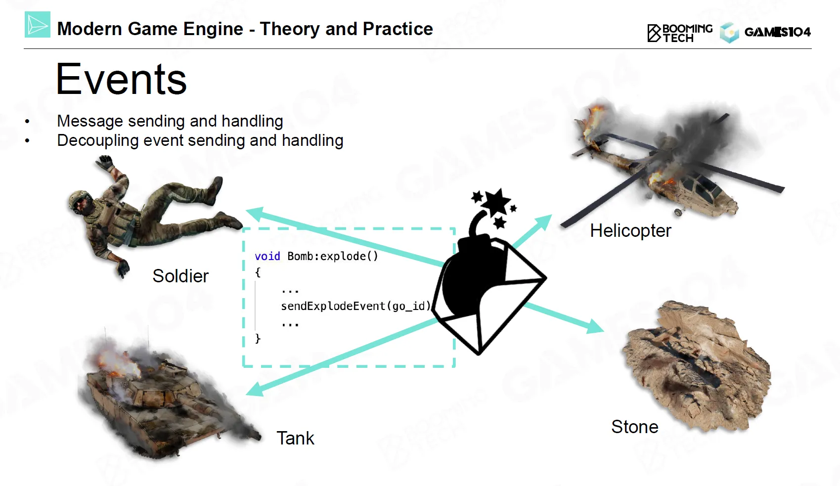 当然在现代游戏引擎中已经抛弃了这种过于低效的通信方式,而是使用 事件(event) 机制实现GO之间的交互。当某个GO需要和其他对象进行通信时,它会直接向相应的对象发送一个event,而接收到这个event的对象则会在下个时钟周期进行处理。这样我们无需考虑系统中每种GO可能的通信方式,通过event机制实现了GO之间的解耦。