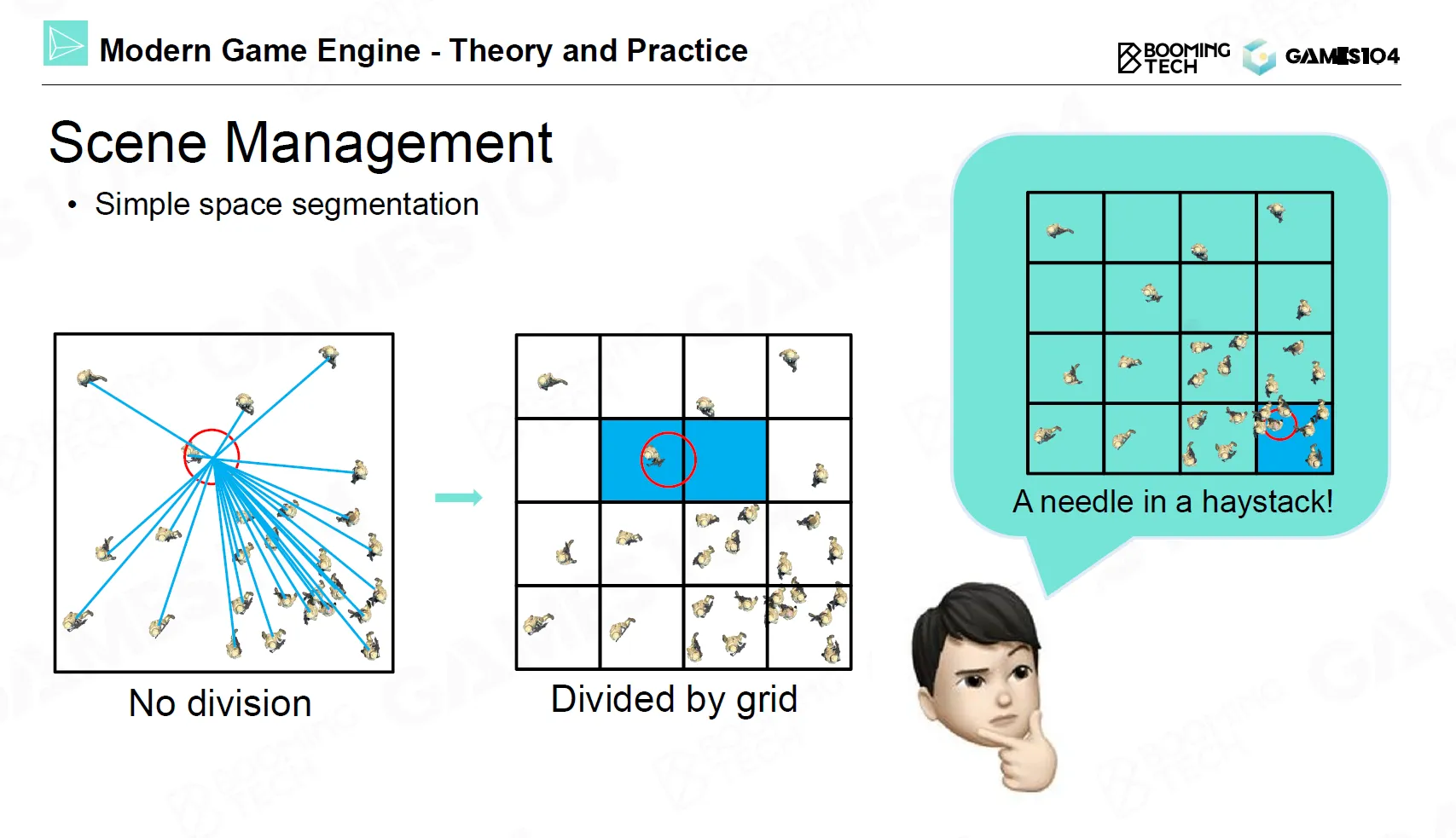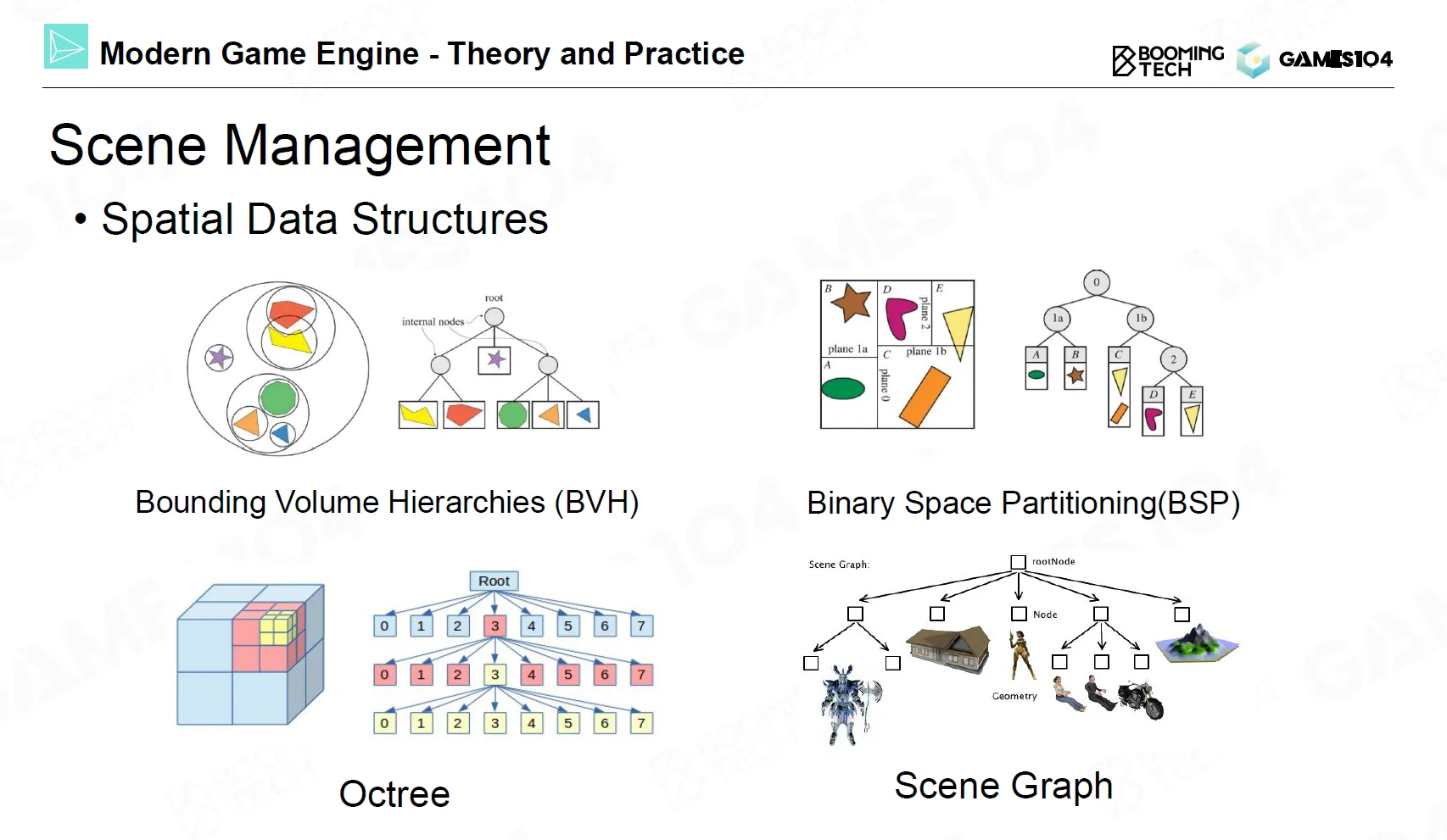 除了四叉树之外,现代游戏引擎进行场景管理时还会使用BVH、BSP、octree、scene graph等不同类型的数据结构。