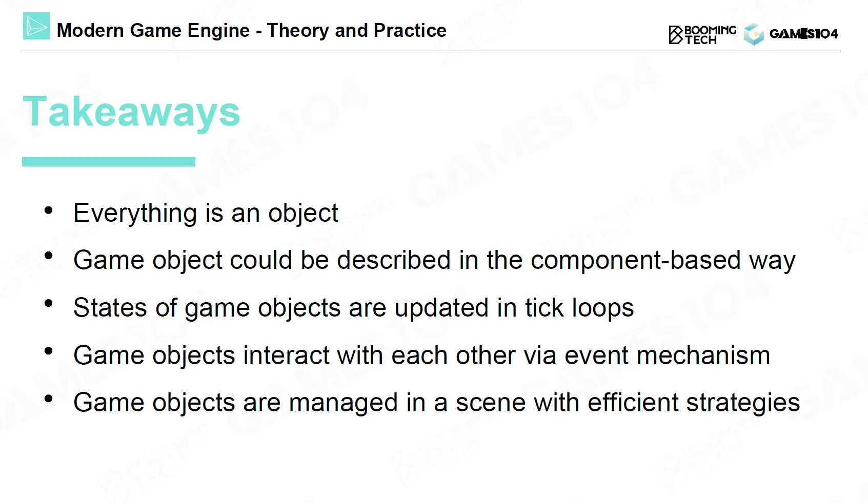 本节课最后讨论了一下商业游戏引擎中event机制的实现。由于不同GO之间的依赖关系,直接使用event进行消息传递可能是不合理的。同时为了高效的利用多核CPU,在商业游戏引擎中会使用「邮局」的方式来代替GO之间的直接通信。「邮局」的意义在于可以保证系统的严格时序,从而确保整个系统是 确定的(deterministic) ,不会由于多核并行产生不同的运行结果。