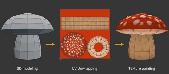2D纹理转换回3D空间将纹理图案应用于3D模型,就是通过查找每个网格模型面的UV坐标完成。