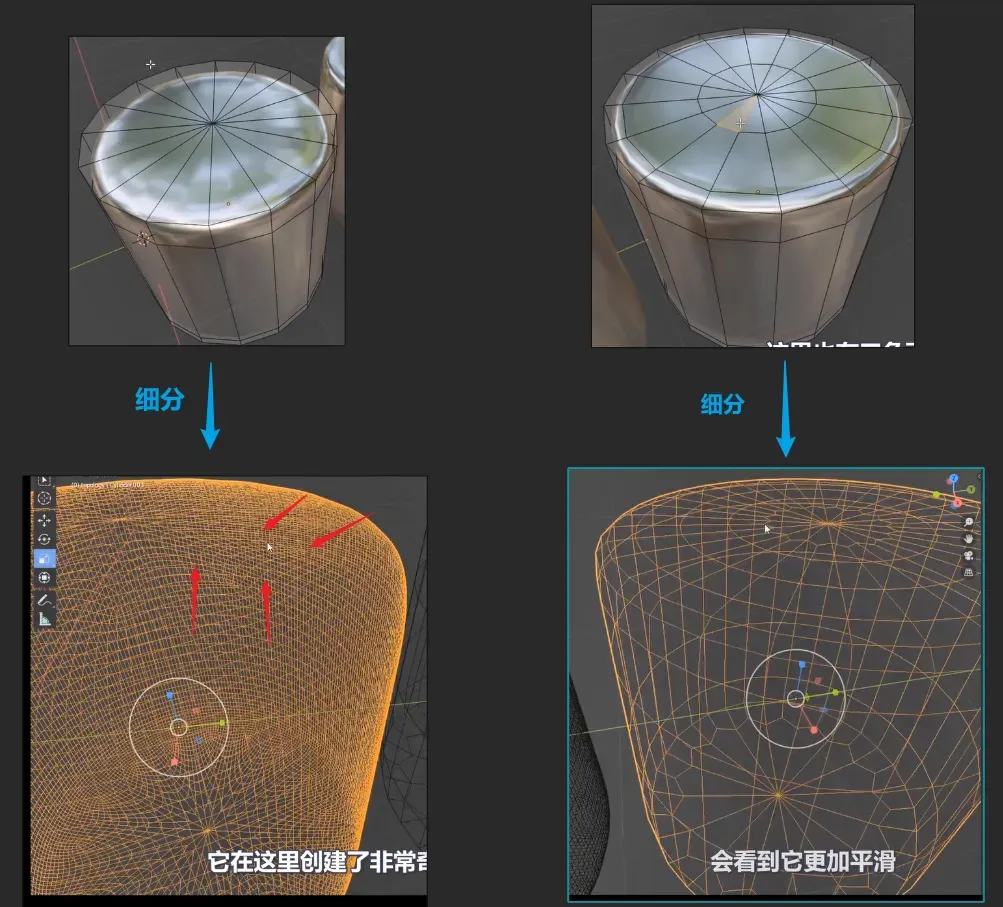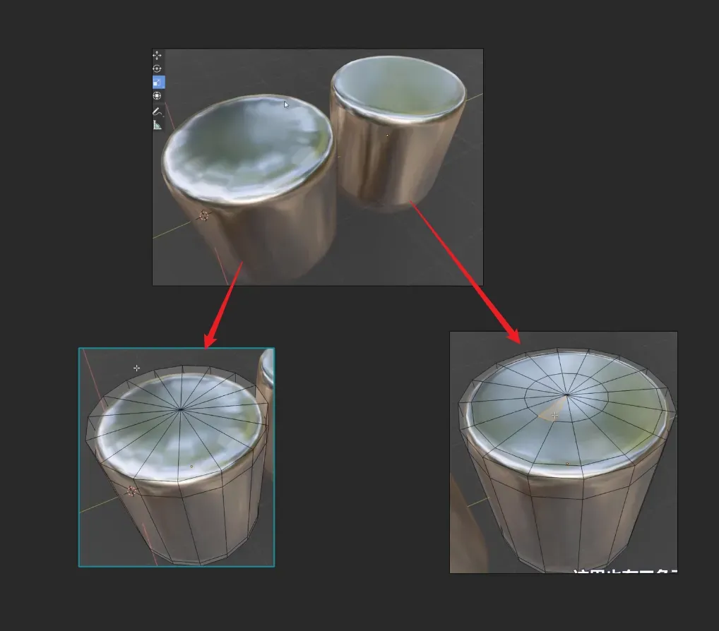下边这个例子就是拓扑好坏的区别:(几何体形状相同,渲出来效果却有区别)